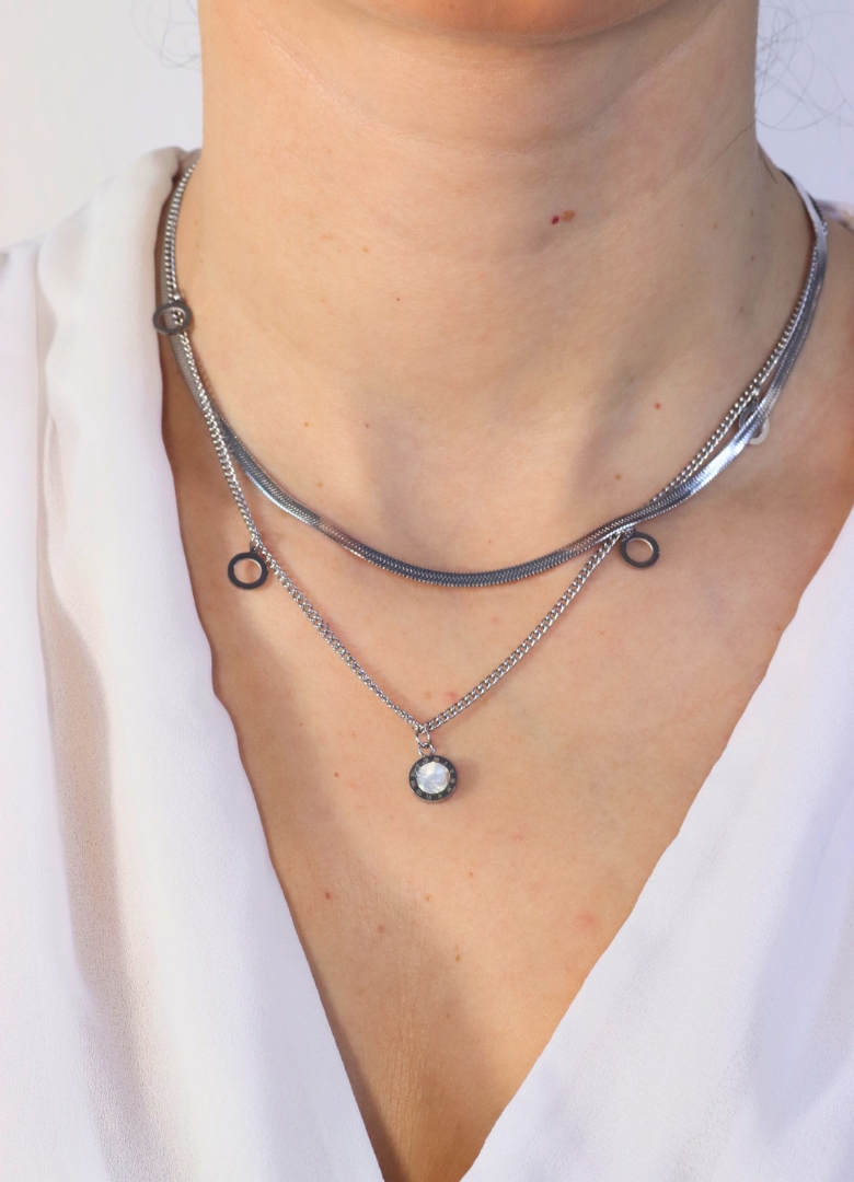 Dunipa Double Chains Roman Numerals and Circles Stainless Steel Necklace – Silver Color