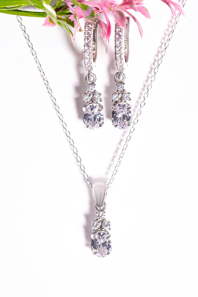 The Elara Jewelry Set is an elegant design, handmade in Turkey from 925 sterling silver. This refined set features a delicate necklace with a 45 cm chain and matching earrings, decorated with sparkling zircon stones in three color variations: Clear, Blue, and Black.