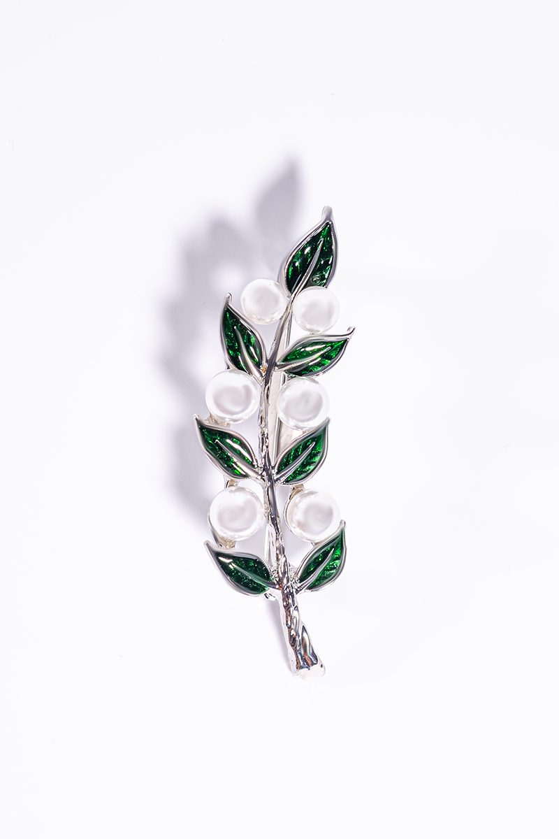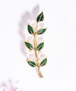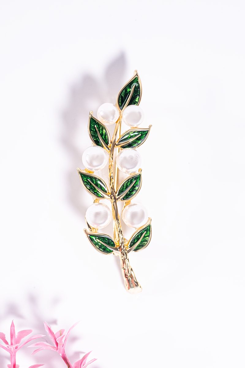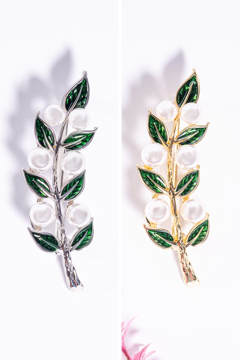 Chic 2-piece brooch set with green leaves and pearl details. Crafted in stainless steel with gold and silver tones. Perfect for dresses, coats, or scarves. Length: 6 cm.
