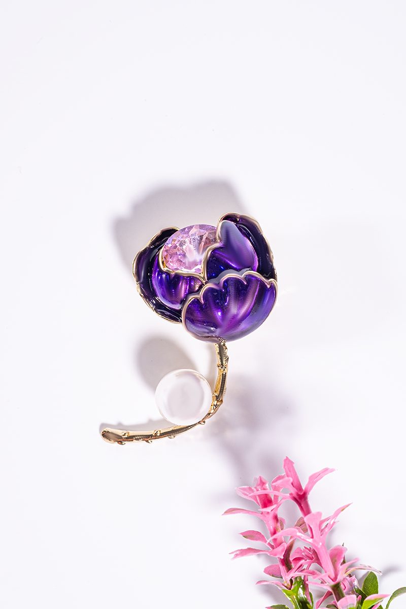 Elegant 3-piece flower brooch set in purple, red, and blue tones. Decorated with sparkling stones and pearl details, crafted in stainless steel with gold plating. Perfect accessory for dresses, jackets, or scarves. Length: 6 cm.