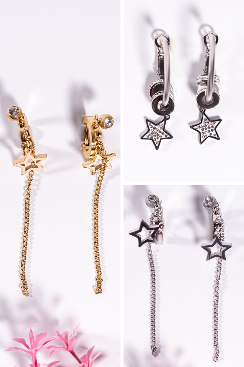 Trendy 6-piece earring set featuring star chain designs and sparkling crystal-detailed hoops. Made of stainless steel, hypoallergenic and durable. Length: 1 – 6 cm.