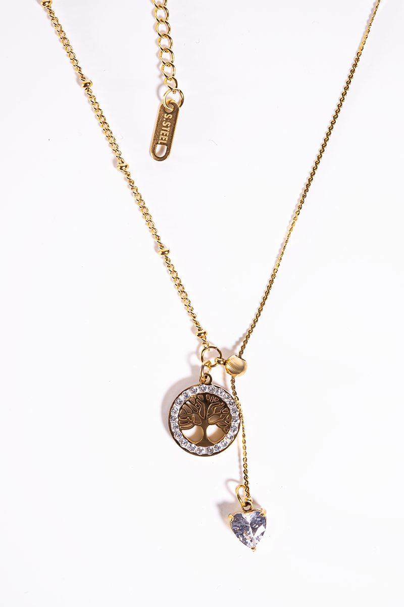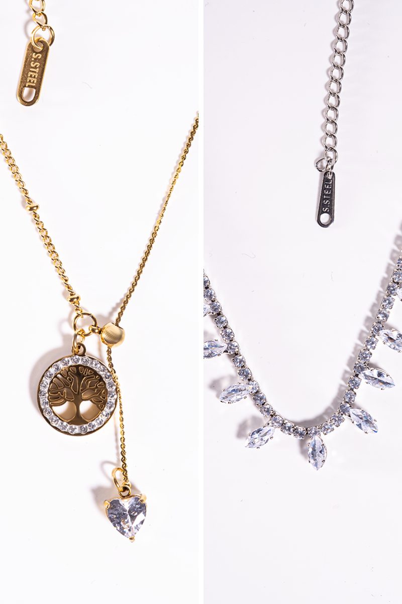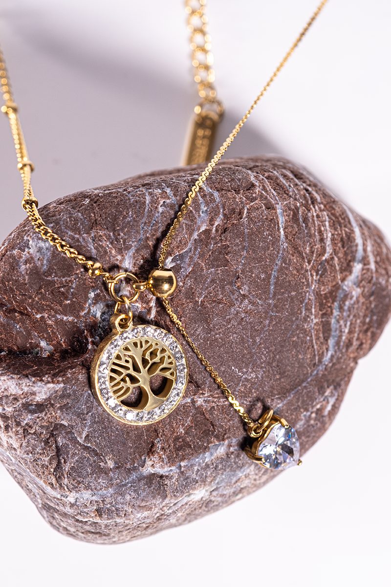 This 2-piece necklace set combines elegance and symbolism. The gold-toned Tree of Life with crystal heart pendant is paired with a refined silver necklace featuring sparkling crystal leaves. Adjustable length 40–45 cm.